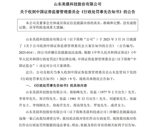 美晨科技曾在3月31日公告称,公司收到中国证监会下发的立案告知书,因公司涉嫌信息披露违法违规,中国证监会决定对公司立案调查。