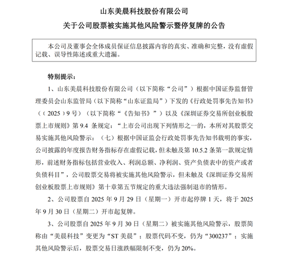 同时,公司股票自9月30日(星期二)被实施其他风险警示,股票简称由“美晨科技”变更为“ST美晨”;股票代码不变,仍为“300237”;实施其他风险警示后,股票交易日涨跌幅限制不变,仍为20%。