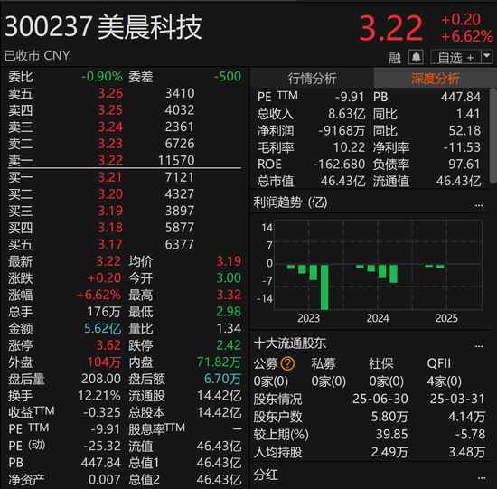 9月26日,美晨科技收报于3.22元/股,上涨6.62%,总市值为46.43亿元。