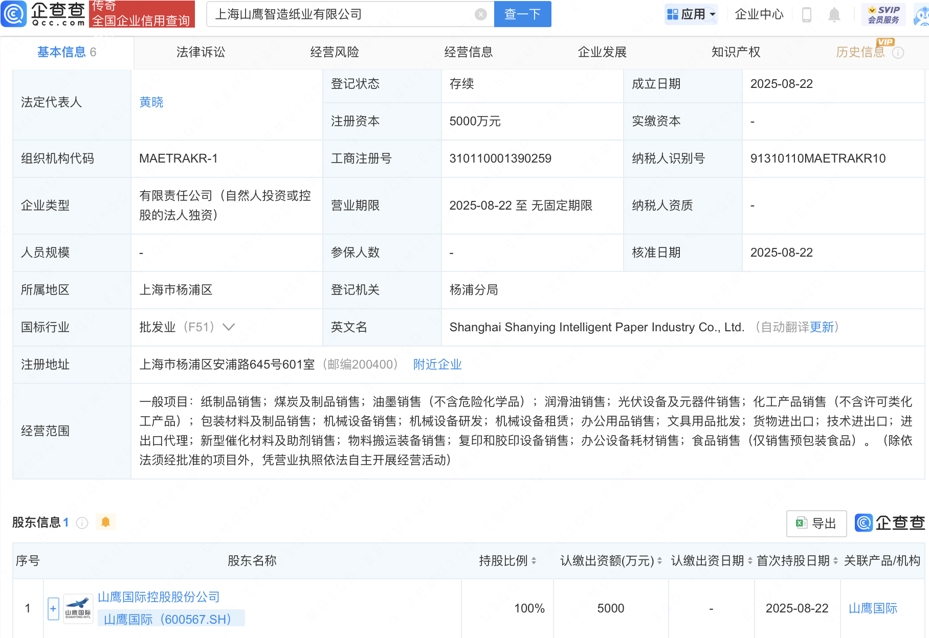 近日,上海山鹰智造纸业有限公司成立,注册资本5000万元全民配资股票平台,经营范围包含:纸制品销售;煤炭及制品销售;油墨销售(不含危险化学品);润滑油销售等。企查查股权穿透显示,该公司由山鹰国际(600567)全资持股。